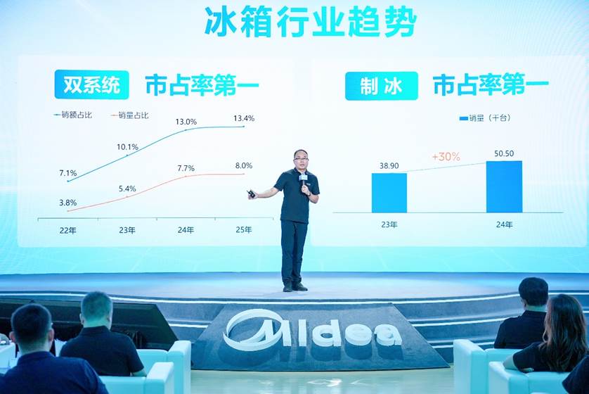 而美的深度契合这一趋势——在行业双系统冰箱赛道中,美的双系统冰箱市占率稳居行业第一,销量占比从2022年的3.8% 增长至2025年的8% ,销额占比从2022年的7.1%攀升至2025年13.4%。可见,美的牢牢抓住趋势红利,已成为消费者拥抱双系统时的首选。