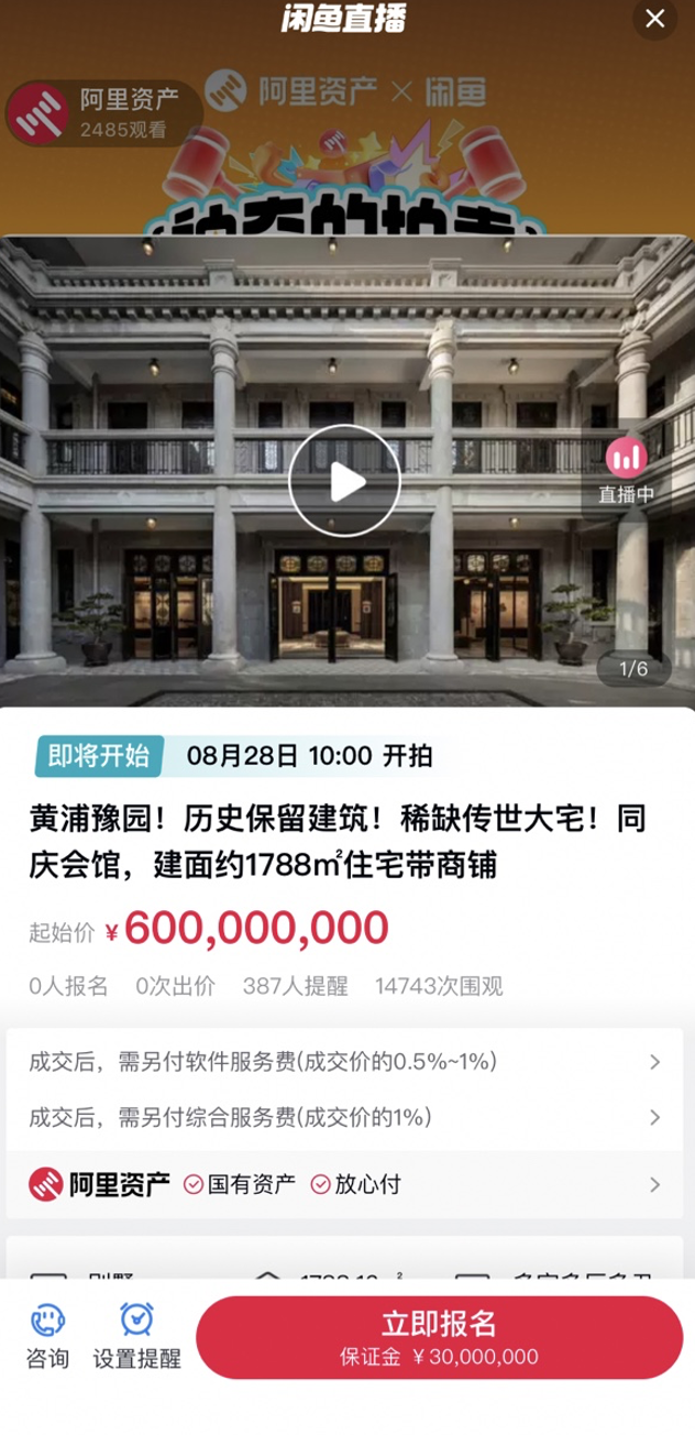 公开宣传资料显示的“同庆会馆”内部装修概况图拍卖详情页显示同庆会馆将于8月28日上午10点正式开拍,上架直播间24小时后,已有近400人设置提醒,吸引了近1.5万次围观。据悉,8月15日上午10点,闲鱼阿里资产官方直播间还将继续就此次拍卖的黄浦豫园“同庆会馆”详情作进一步直播讲解。