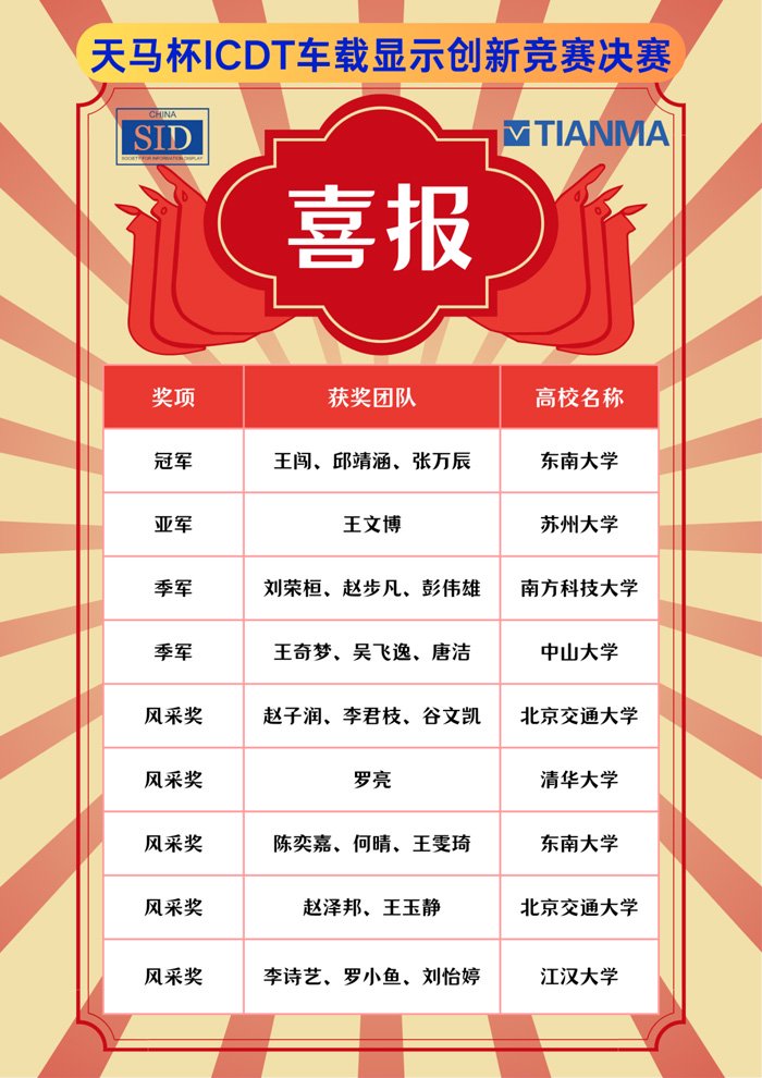 2025年8月9日,首届“天马杯”ICDT车载显示创新竞赛圆满落幕!本届创新竞赛由SID China和天马微电子联合主办,以“车载显示技术”为主题,面向全国高校学生团体,鼓励参赛团队围绕显示领域前沿技术,发挥个人科研兴趣和创新能力,提出具备实际应用价值的解决方案。作为一项全国性赛事,竞赛不仅为高校学生提供丰富产业应用知识、培养实践能力的平台,更致力于推动显示技术的创新发展与应用。