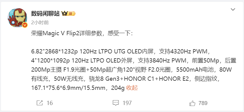 荣耀Magic V Flip2已经定档,将于8月21日发布,博主 @数码闲聊站 今日提前曝光了新机的详细参数信息。
