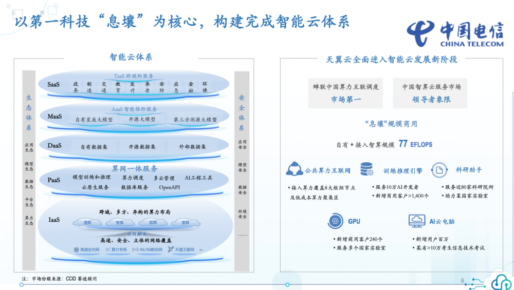 据了解,目前中国电信以第一科技“息壤”为核心,已经构建完成智能云体系,基于云网融合,提供“算力+平台+数据+模型+应用”一体化的智能云服务。