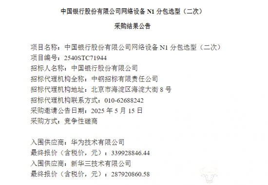 近日,中国银行一项应答报价超过3亿元的网络设备选型项目公布采购结果,两家入围供应商报价差距明显,运营商财经网将具体介绍。