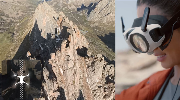 操控方面,用户带上Vision飞行眼镜就能体验全景实时画面,支持自由转头查看视角,飞行中可自由看向四方,而飞行路线始终稳定向前。