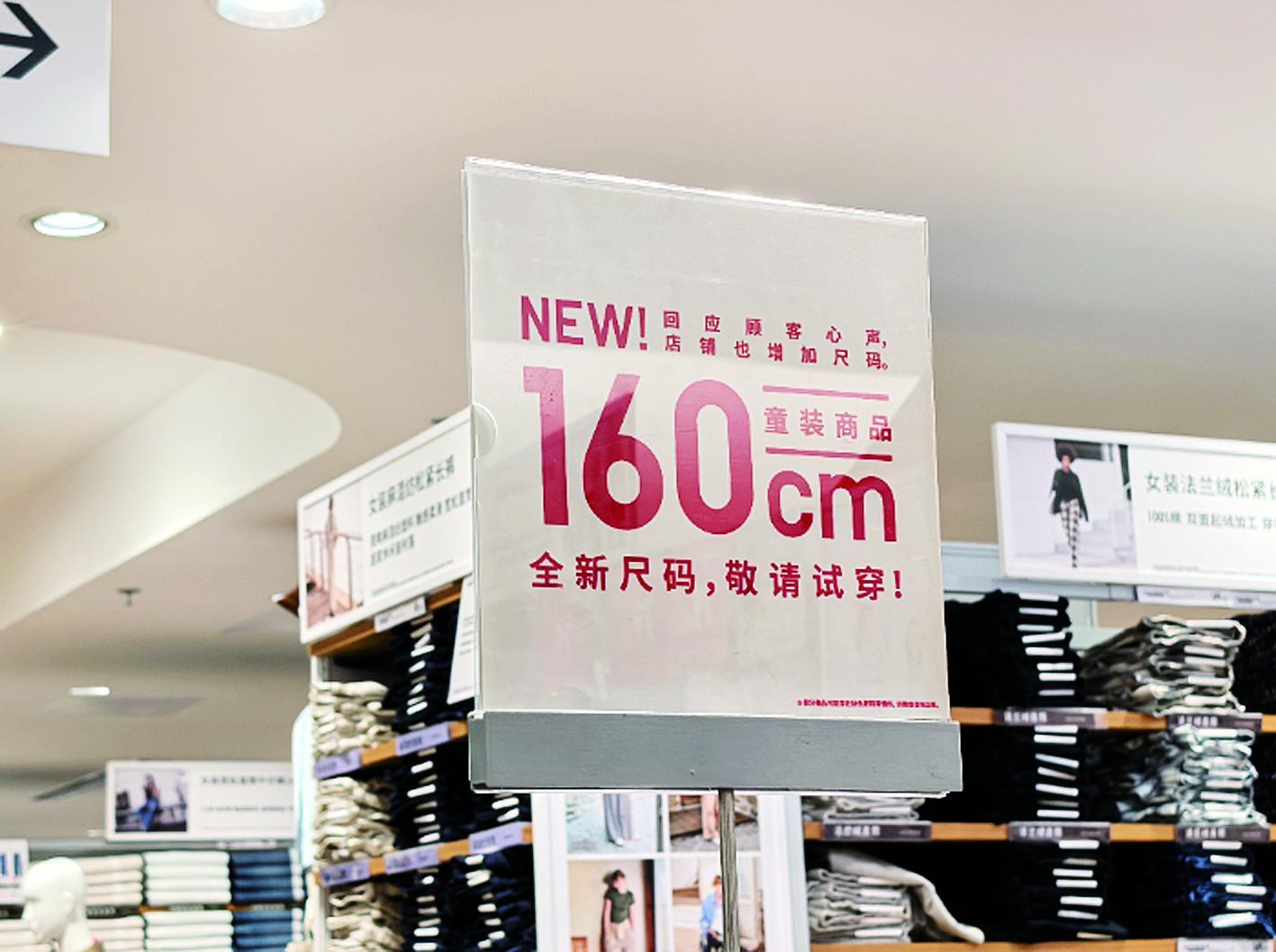 优衣库店内的“回应顾客心声,童装商品增加160cm全新尺码”告示牌。