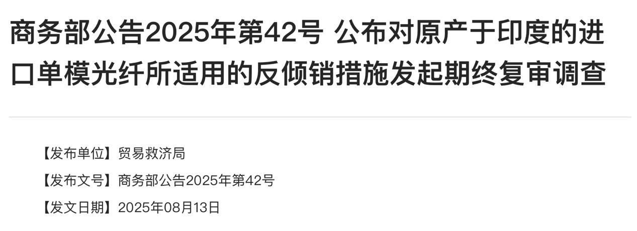 C114讯 8月15日消息(南山)商务部8月13日发布第42号公告,公告称根据《中华人民共和国反倾销条例》第四十八条规定,决定自2025年8月14日起,对原产于印度的进口单模光纤所适用的反倾销措施进行期终复审调查。对原产于印度的进口单模光纤所适用的反倾销措施发起期终复审调查。