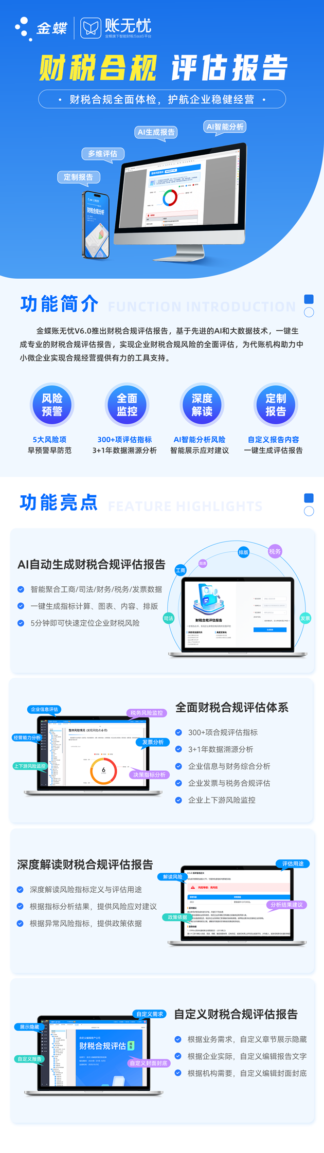 值得关注的是,金蝶账无忧V6.0即将重磅推出财税合规服务,基于先进的AI和大数据技术,一键生成专业的财税合规评估报告,实现企业财税合规风险的全面评估,助力财税服务机构为客户提供高价值合规服务。