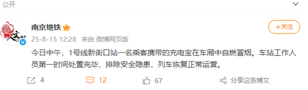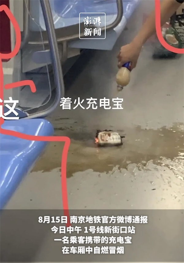 今日中午,1号线新街口站一名乘客携带的充电宝在车厢中自燃冒烟。车站工作人员第一时间处置完毕,排除安全隐患,列车恢复正常运营。