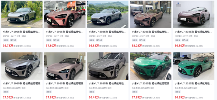 已经交付的小米 YU7 在二手市场的价格也居高不下,原价为 25.3 万元的 YU7 标准版在二手车商处的最低价格为 26.8 万元左右。SU7 和 SU7 Ultra 的二手车价格则随着保有量上的上升而有一定程度的下降。