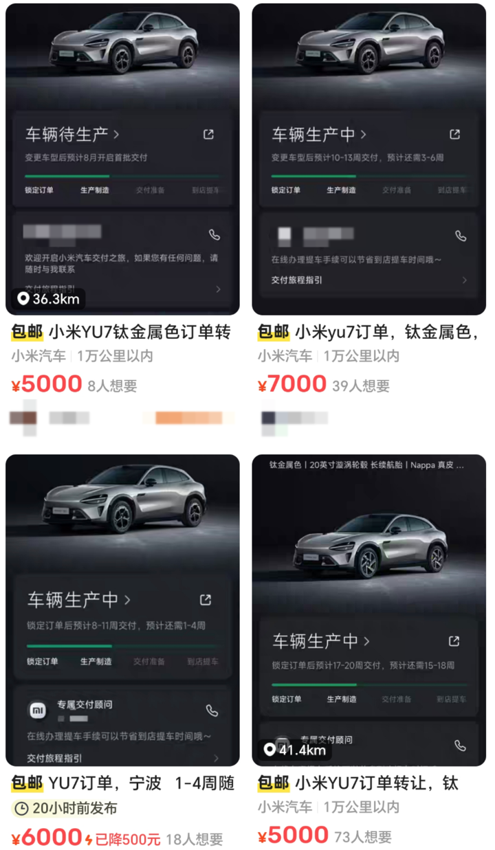 目前在二手平台上以「小米 YU7」为关键词进行搜索,有相当多的车主在转让生产排期较为靠前的订单,普遍加价幅度在 2500 元至 5000 元不等,但由于小米官方并不支持变更提车人,因此大多数人采用的是在提车后进行「手拉手」过户的方式。