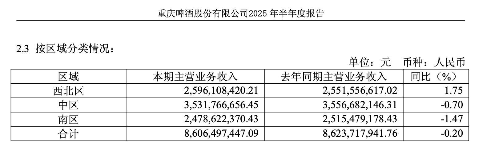 重庆啤酒今年上半年各区域收入情况。