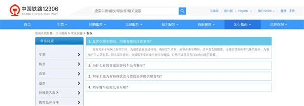 据了解,12306官网显示,在常见问题一栏中提到了“旅客在乘车期间的用餐注意事项”,具体如下: