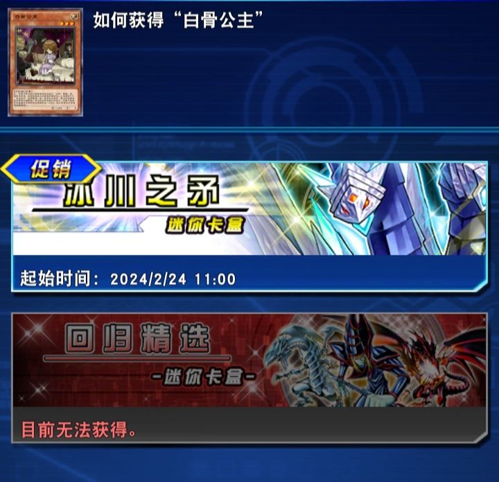 无需为白骨公主抽取冰川之矛小包,她即将回归常驻池。离线一个月以上登录可获得回归小包,完成任务还能获取80抽,已有黑魔导、机皇卡组及白骨公主。