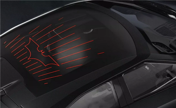 此外,设计师在轮毂盖、后保险杠、车窗、后车门、后挡风玻璃都加入了蝙蝠标志,车顶玻璃上还有发光的《黑暗骑士三部曲》蝙蝠标志。