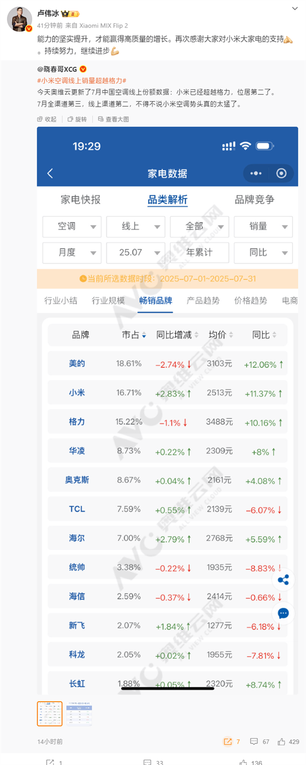 值得一提的是,卢伟冰还蹭偷了,小米今年的目标是公开市场销量第三,未来5年成为数一数二的空调品牌。