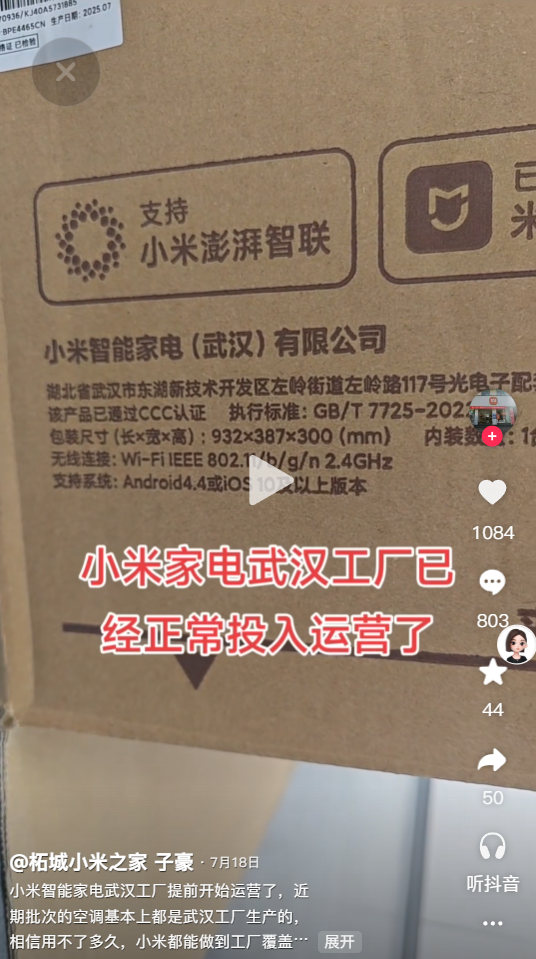 据抖音用户“柘城小米之家 子豪”近期发布的视频显示,小米智能家电工厂已经提前开始运营了,近期批次的空调基本都是武汉工厂生产。