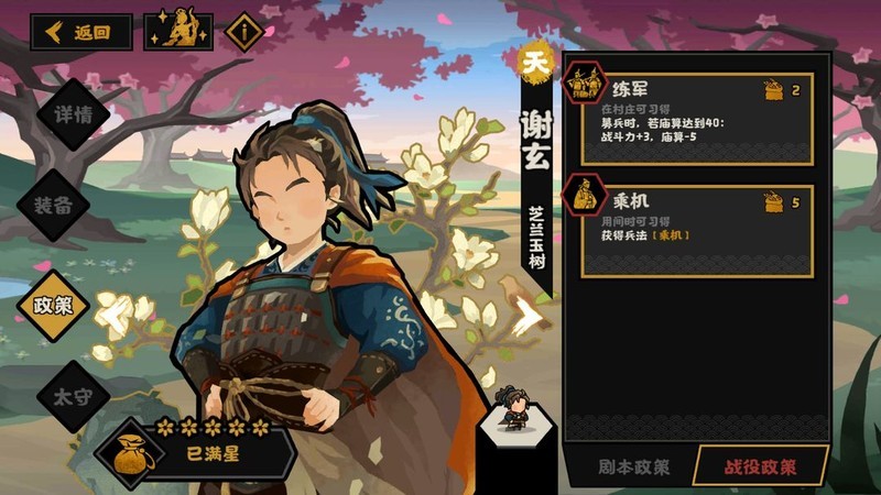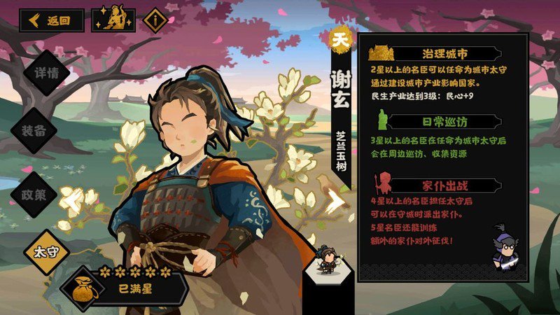 谢玄太守效果对他自身而言十分理想,能有效抵消一政策带来的民心消耗,具备一定联动优势。然而由于当前民心整体作用有限,因此暂不建议优先升级装备。