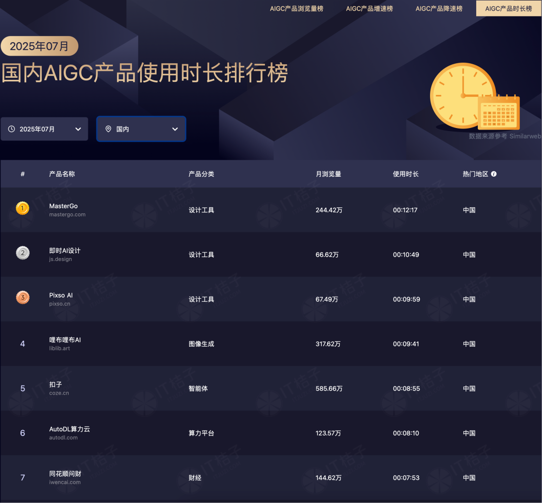 2025年7月国内AIGC产品使用时长榜单显示设计工具(MasterGo、即时AI)包揽前三,但使用时长(最高12分17秒)显著低于全球榜单(17分+)。