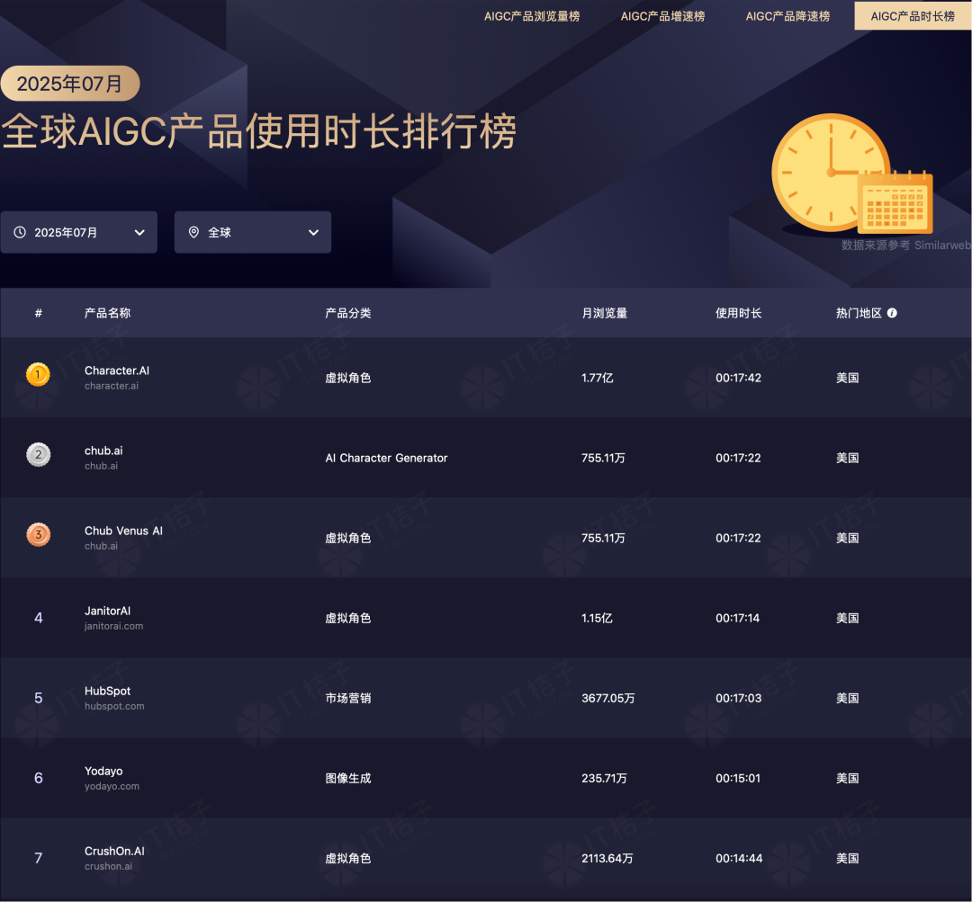 2025年7月全球AIGC产品使用时长榜单显示,虚拟角色类产品主导:Character.AI(1.77亿浏览量)、JanitorAI(1.15亿)等占据Top 7中的4席,平均使用时长超17分钟。