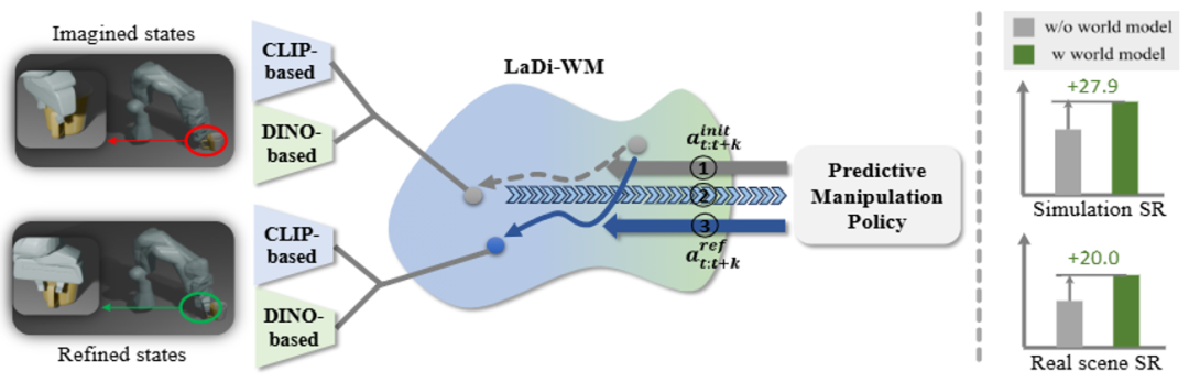 基于 LaDi-WM,团队设计了一种扩散策略,该策略通过整合世界模型生成的预测状态来迭代地优化输出动作,从而生成更一致、更准确的动作结果。通过在虚拟和真实数据集上的大量实验,LaDi-WM 能够显著提高机器人操作任务的成功率,尤其是在 LIBERO-LONG 数据集上提升 27.9%,超过之前的所有方法。