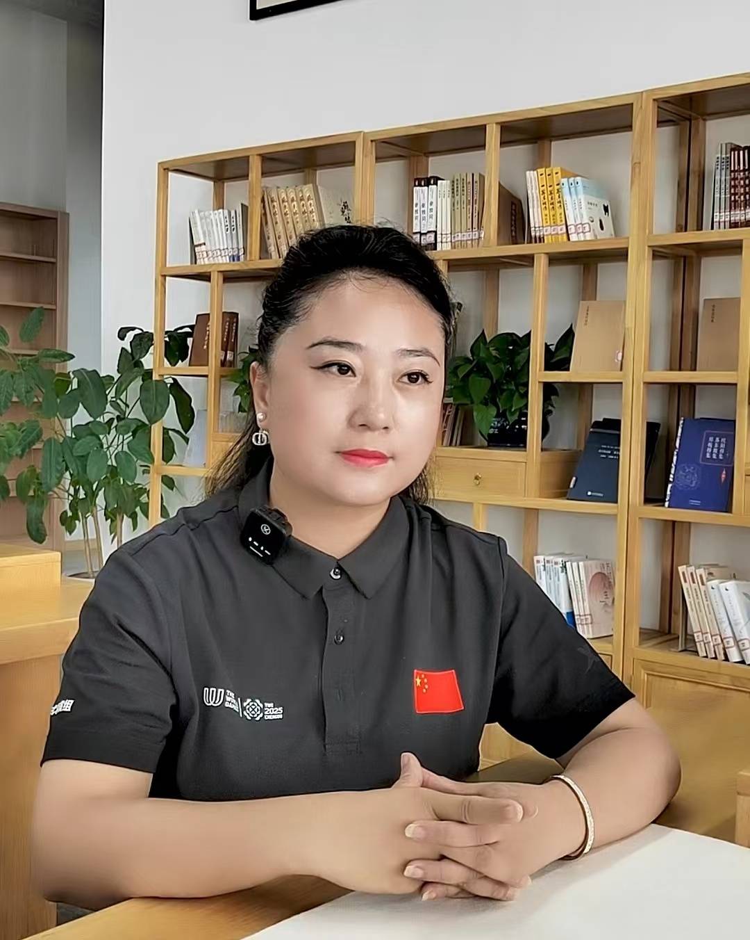 初见谢丹霞,身着简单的黑色POLO,前胸印着的国旗鲜艳夺目,头发简单地向后扎了一个马尾,画着淡妆但不失英气,眼神坚定而有力……