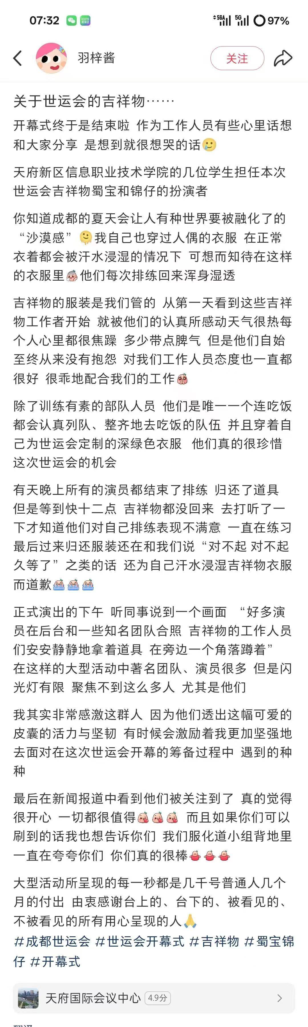 我们开幕式就是使用的秦皇湖的“成都屋檐”为场地,它是现有的一个场地空间,在满足导演组场地及创意需要的同时,也体现我们四海一家亲,命运共同体的创作初衷。正如我们总导演胡晓说的,全球休戚与共同在一个屋檐。又有城市作为背景城市楼侧面体现近些年成都的发展变化。这次闭幕式是在世博园旧址,导演组选择了国际友谊馆,这个名字就很能体现这次闭幕式的创作初衷了。