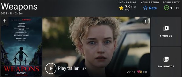 月初上映的华纳新片《凶器》是上周票房冠军,上映十天拿下1.5亿美元全球票房,口碑与票房双丰收:
