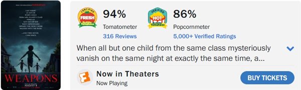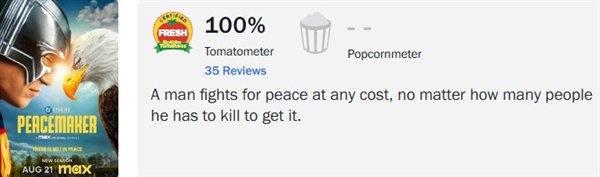 另外,《碟中谍8:最终清算》已释出流媒体版;《F1:极速狂飙》22号上流媒体;《和平使者》第二季播映在即,烂番茄新鲜度百分百: