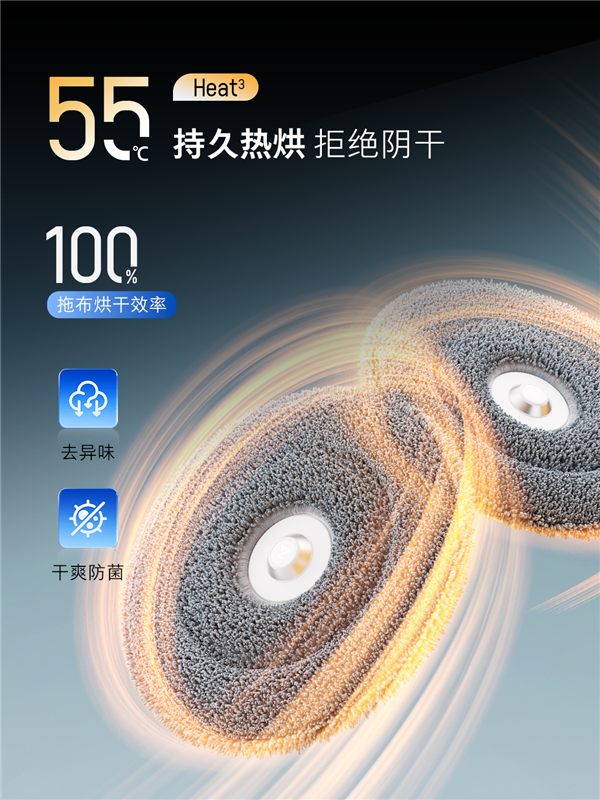 -55°C持久热烘采用超短双风道设计,拖布烘干效率达100%,彻底告别阴干霉味。
