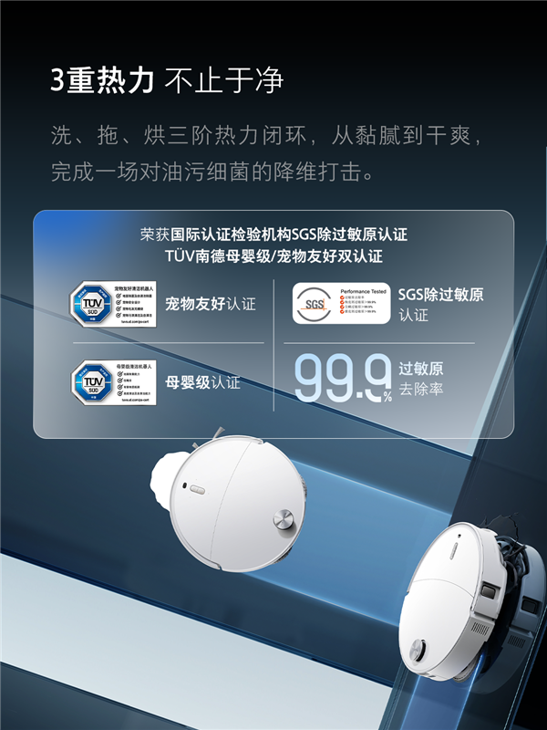 -60°C增压热拖搭配12N仿生加压,实现99.99%地面除菌率与100%擦地去污率,快速溶解顽固污渍;