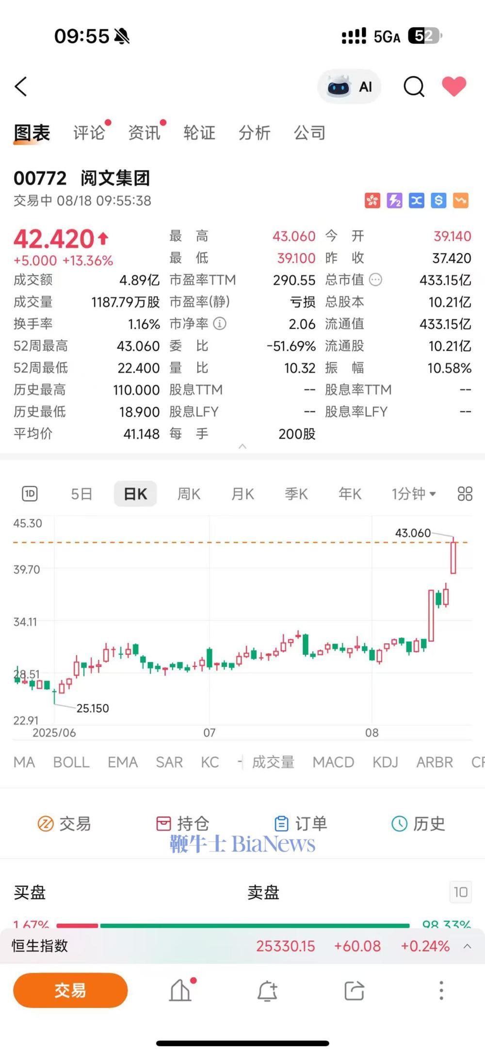 8月28日,港股开盘半小时,阅文再涨13%,股价创52周新高,总市值433.15亿港元。