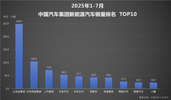 在1-7月重点汽车集团新能源汽车销量前十中,比亚迪独占鳌头,销量甚至超过了第二、三、四名销量之和。