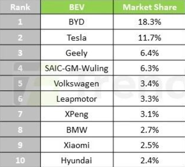 从品牌竞争格局来看,比亚迪以绝对优势稳居榜首,市占率高达18.3%,销量年增长率更是达到 43%,其在纯电动车市场的龙头地位进一步巩固。