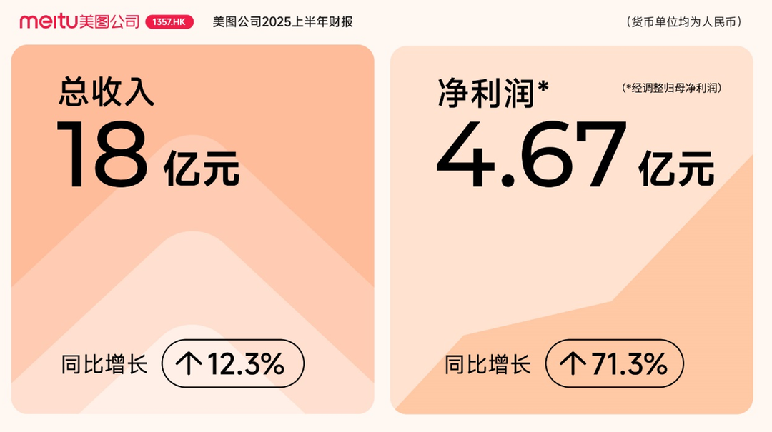 8月18日,美图公司披露2025上半年财报:总收入18亿元(人民币,下同),同比增长12.3%。经调整后归属于母公司权益持有人净利润4.67亿元,同比增长71.3%。