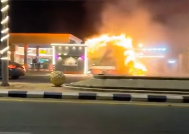 视频显示,在沙特利雅得一处加油站附近,一辆卡车上方突然燃起大火,情况十分危急。