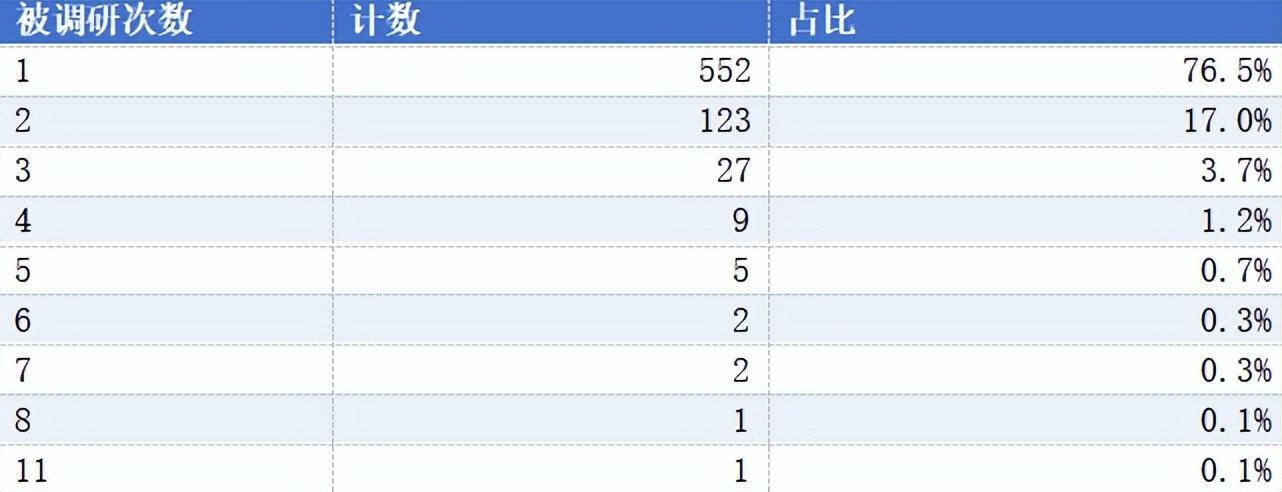 同花顺数据显示,仅被调研1次的上市公司数量最多为552家,占比达76.5%;被调研2次的上市公司数量为123家,占比达17.0%;被调研3次的上市公司数量为27家,占比达3.7%;被调研4次的上市公司数量为9家,占比为1.2%;被调研11次的上市公司则仅有一家。