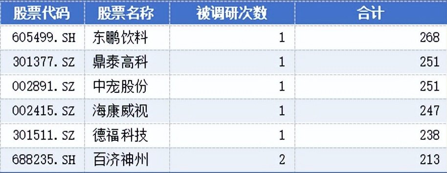 除了东鹏饮料,仅被调研了1至2次,但机构参与数量却超过200的公司还有鼎泰高科、中宠股份、海康威视、德福科技、百济神州,数量分别为251家、251家、247家、238家、213家。