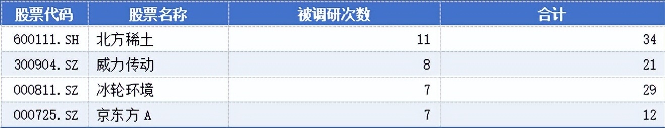 被调研11次的上市公司为北方稀土,近3个月以来,有包括东方证券、光大证券、西部证券、国信证券、国联民生、华安证券等在内的34家证券公司、基金公司、保险公司、海外机构参与了对北方稀土的调研。