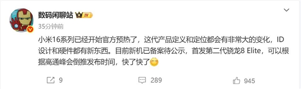 快科技8月18日消息,博主数码闲聊站表示,小米16系列产品定义和定位都有非常大的变化,ID设计和硬件都有新东西,目前新机已备案但还没公示,首发骁龙8 Elite 2,可以根据高通峰会倒推发布时间,很快就亮相。