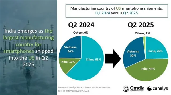 完事到现在呢,根据2025年7月底的报道,印度已经历史性地超越中国,成为向美国出口iPhone的最大来源国。