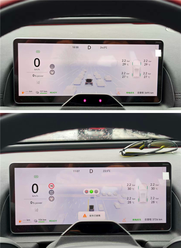 实际体验中,方向盘的左侧中间按键可一键打开辅助驾驶功能,支持车辆自动跟车、变道、紧急转向等。摄像头实时监测车道路况,并经过UI渲染呈现在车机仪表上,能够清晰了解到自己和旁车的行驶意图,使用辅助驾驶功能时也更安心。