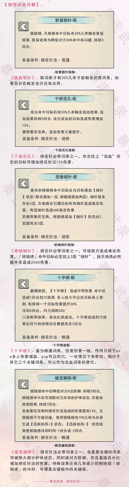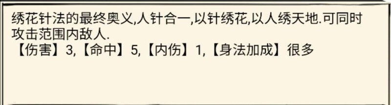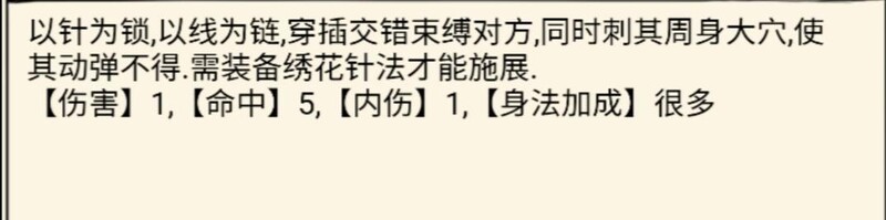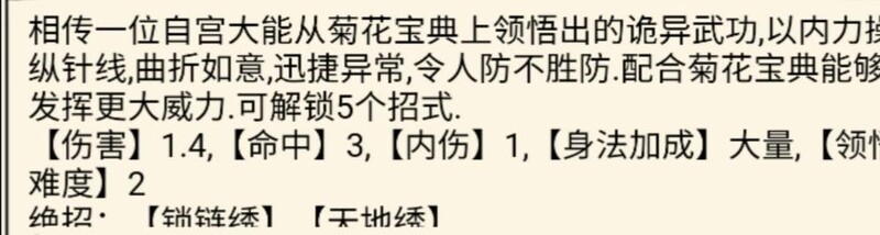 简介:据说是一位宫中高手从菊花宝典中悟出的奇特武学,以内力操控针线,变化莫测,速度极快,令对手难以防范。配合菊花宝典可发挥更强威力,解锁五个招式。