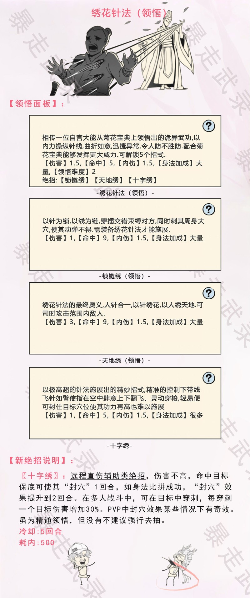 暴走英雄坛V1.0全新武功绣花针法登场!源自菊花宝典的诡异武学,以内力操控针线,攻防一体,控制与直伤招式兼具。获取方式多样,搭配逍遥派门派绝学,展现独特战斗风格。