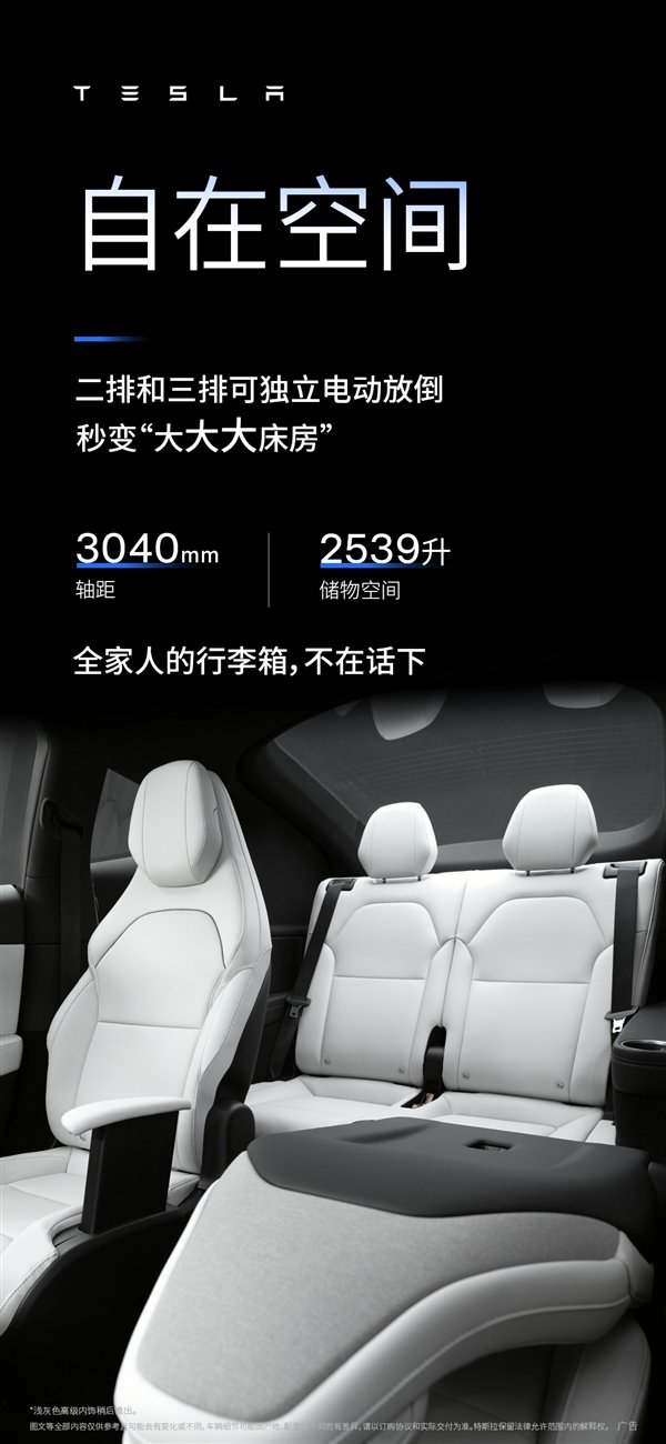 新车车身尺寸加长,首次推出六座版Model Y,音响、座椅、底盘等方面也全面升级。