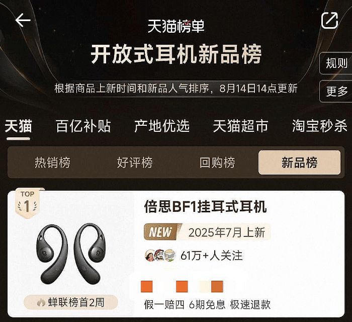 近日,知名数码品牌倍思推出BF1耳挂式耳机,以多项创新技术重新定义高端舒适体验新标准,并在天猫开放式耳机新品榜蝉联榜首2周,赢得众多消费者青睐。