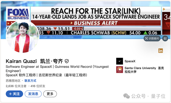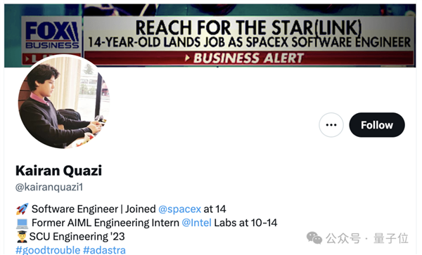 2年前,14岁的Kairan Quazi从圣克拉拉大学毕业,被马斯克pick,加入入职成功率仅有0.2%的SpaceX,成为Starlink部门最年轻的软件工程师——这是SpaceX工程密度最高的部门之一。