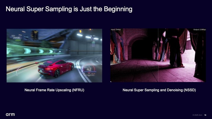 Arm 给出了这项技术的一个应用场景:先对场景中约 25% 的像素进行渲染,大幅节省算力、能耗、时间,然后通过 Arm NSS 优化图像,比如从 540P 优化升级到 1080P。