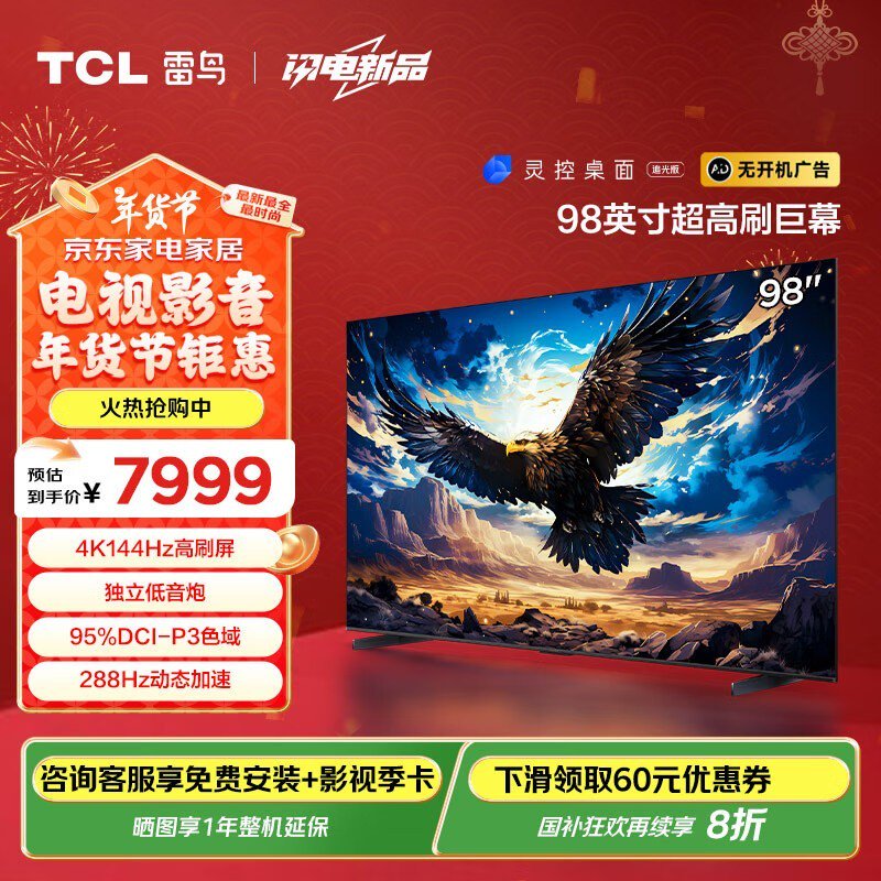 TCL雷鸟鹏7系列98英寸电视直降1599元,到手价6399元