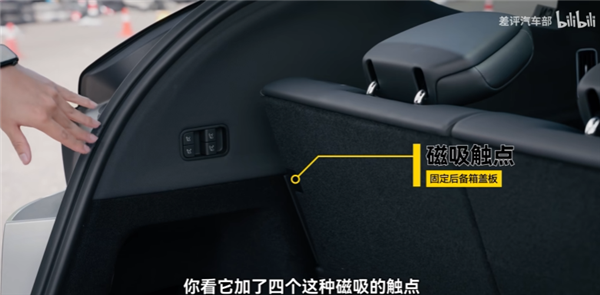 咱们有时候需要用到后备箱盖板下面的空间,而盖板又不是很好固定,所以特斯拉这次在靠背后面直接设计了一个小的磁吸触点。