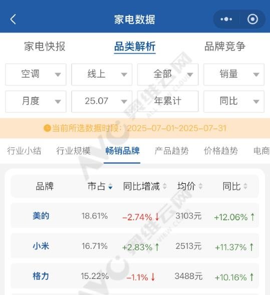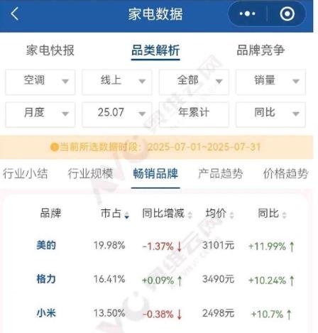 不过,值得关注的是,有网友指出,相关数据并不准确,另一份奥维云网截图显示,7月份,空调线上销量TOP3按排名分别为美的、格力、小米。其中,美的市占率为19.98%,同比下降1.37%;格力市占为16.41%,同比增长0.09%;而小米市占为13.50%,同比下降0.38%。