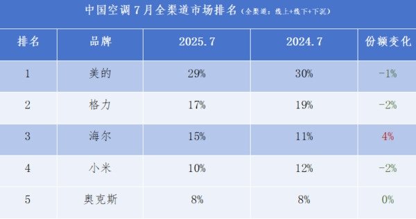 而从全渠道(线上+线下+下沉)市场排名来看,TOP3分别为美的、格力、海尔。其中,美的29%、格力17%、海尔15%。小米则位居第4。